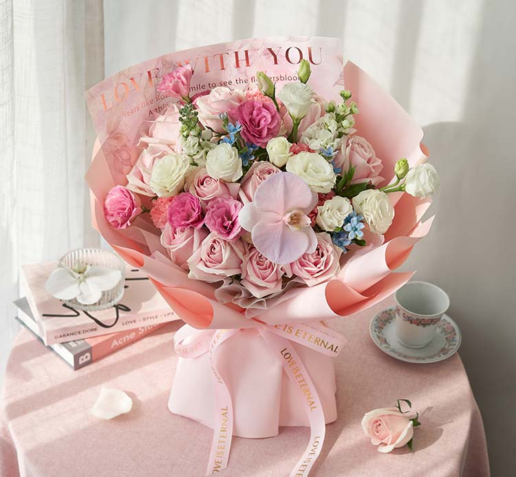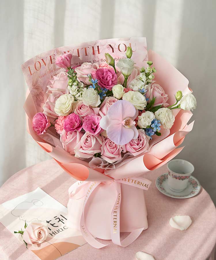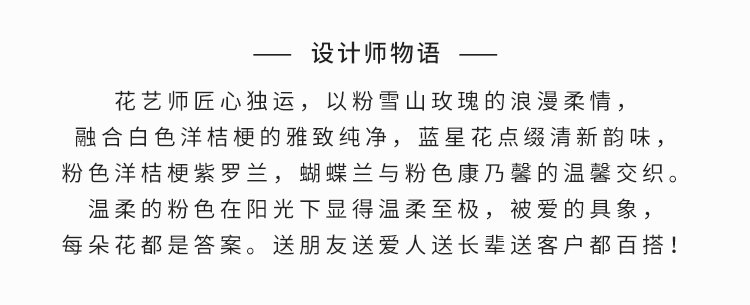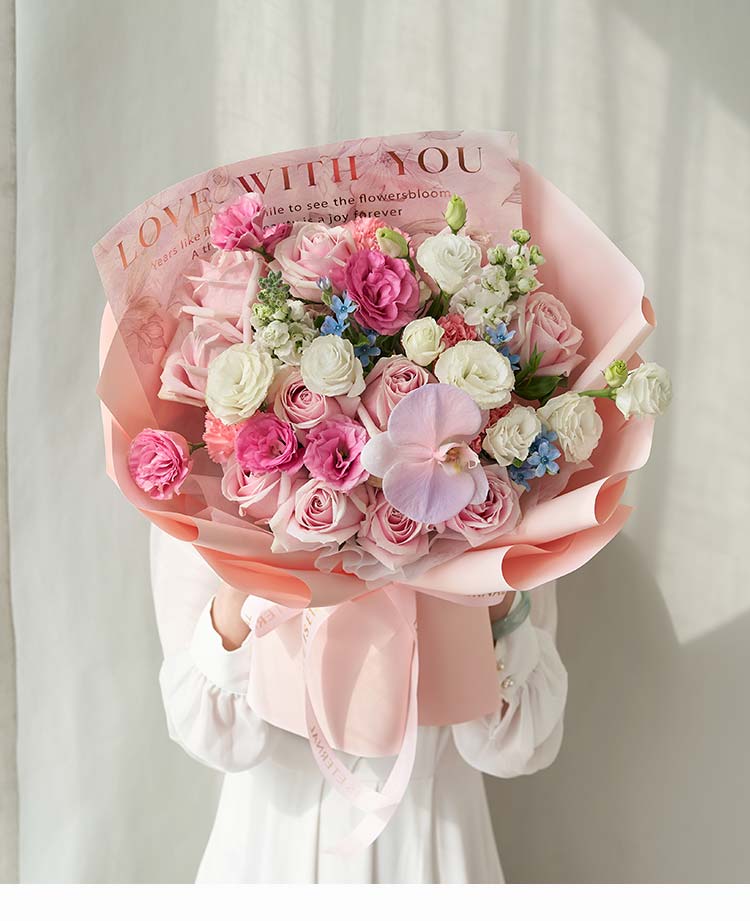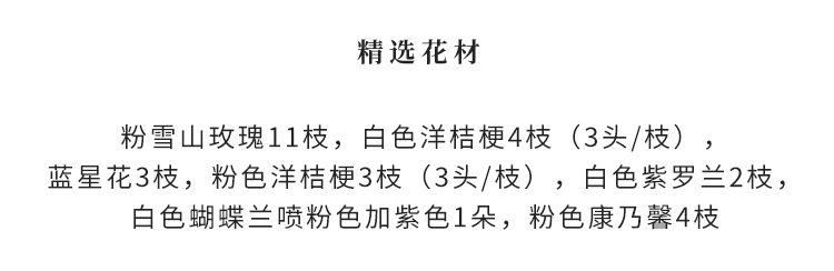 粉雪山玫瑰11枝(或洛神玫瑰),白色洋桔梗4枝(3头/枝),蓝星花3枝,粉色洋桔梗3枝(3头/枝),白色紫罗兰2枝,白色蝴蝶兰喷粉色加紫色1朵,粉色康乃馨4枝