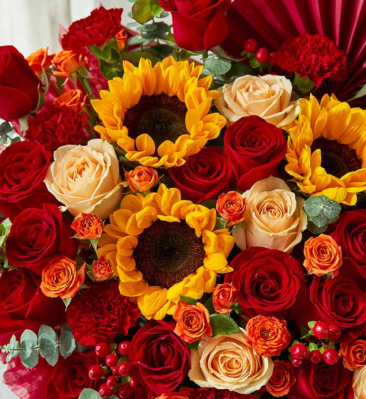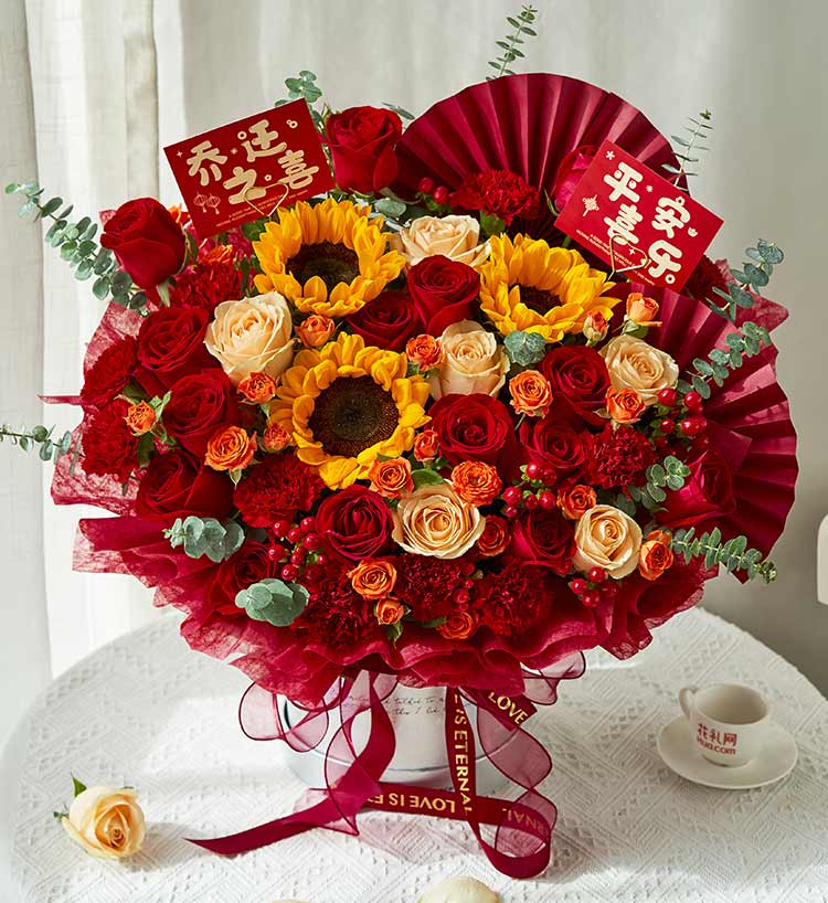红玫瑰15枝,向日葵3枝,红色康乃馨10枝,橙色多头泡泡5枝(3头以上)香槟玫瑰6枝,红豆6枝,尤加利叶20枝;乔迁之喜卡片两张