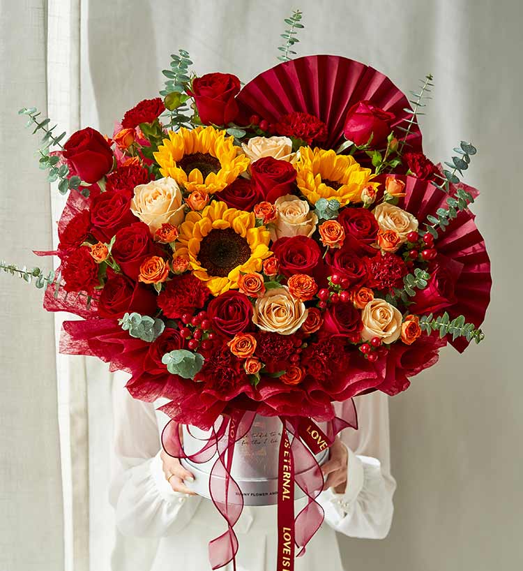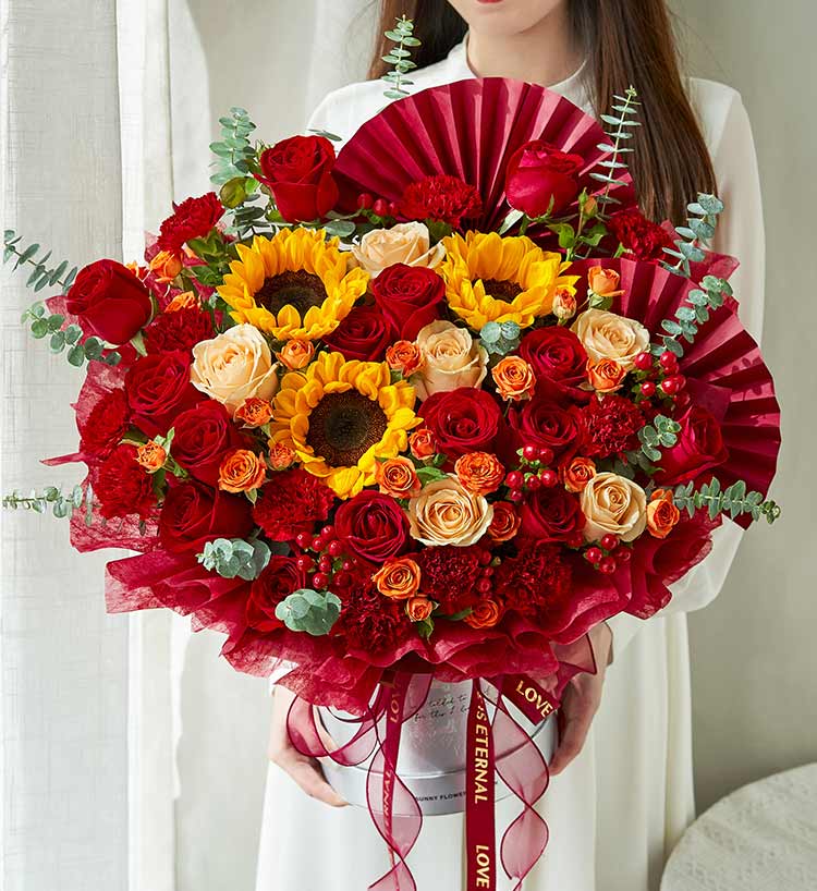 [乔迁之喜大号抱抱桶] 红玫瑰15枝,向日葵3枝,红色康乃馨10枝