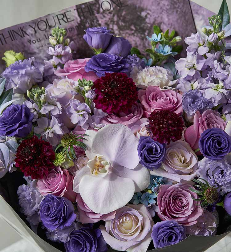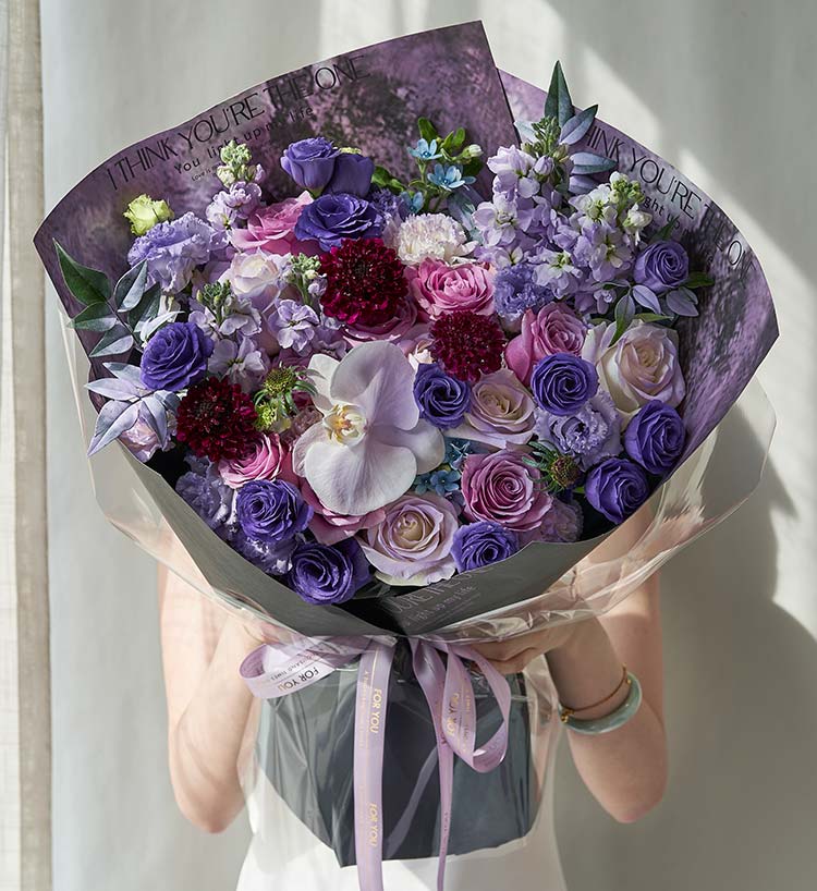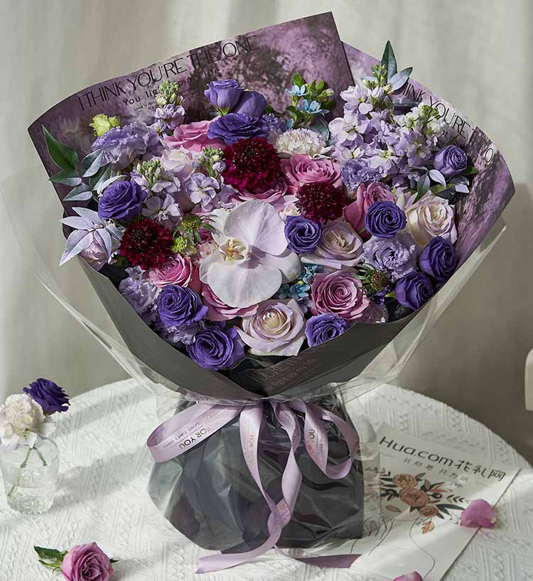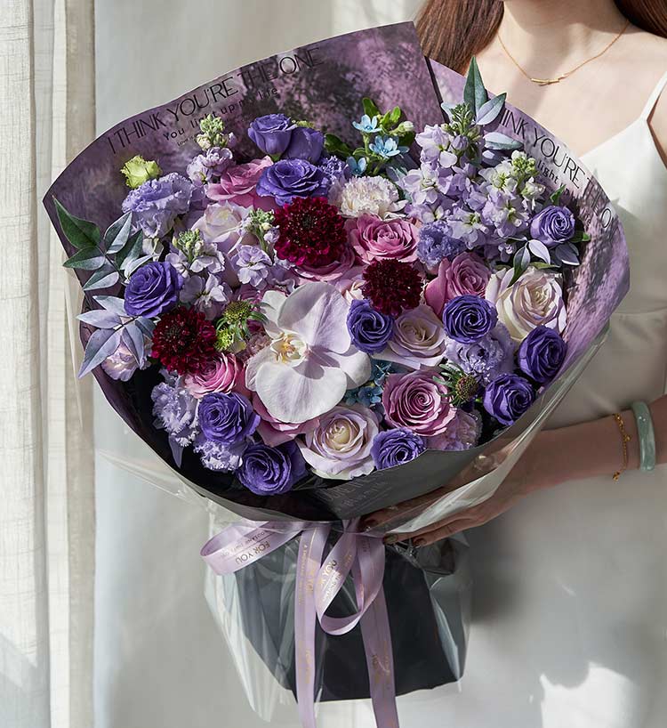 紫色玫瑰8枝,白色骄傲玫瑰5枝(喷淡紫色),白色康5枝(喷淡紫),紫色紫罗兰5枝,白色蝴蝶兰1朵(喷淡紫),红黑色松虫草3枝,深紫色桔梗5枝(3头以上),农民紫卷边桔梗4枝(3头以上),蓝星花2枝,九星叶3枝喷紫色