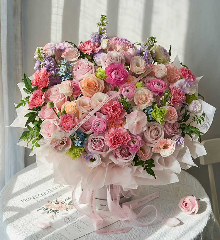 粉玫瑰12枝,香槟玫瑰4枝,白色蝴蝶兰1朵,粉康乃馨8枝,白色桔梗6枝(3头以上)喷粉色和紫色,蓝星花4枝,紫色紫罗兰4枝,粉洋牡丹7枝,九星叶7枝