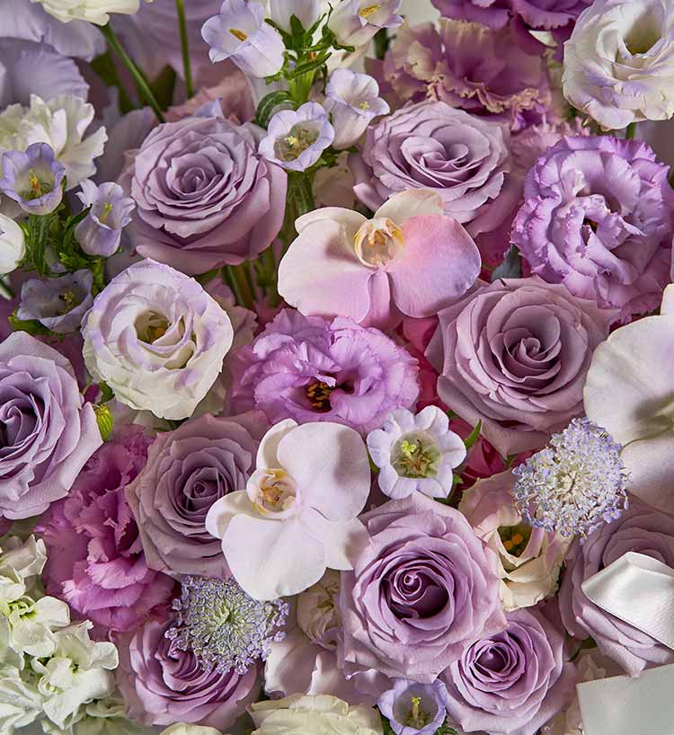 浅紫色玫瑰11枝,白色蝴蝶兰3朵(喷浅紫),紫色卷边桔梗7枝(3头/枝),白色桔梗喷浅紫3枝(3头/枝),浅紫色剑兰4枝,白色紫罗兰4枝,紫色风铃5枝,紫色翠珠5枝,粉色绣球1枝,粉掌2枝喷紫色,白色康乃馨喷紫色6枝