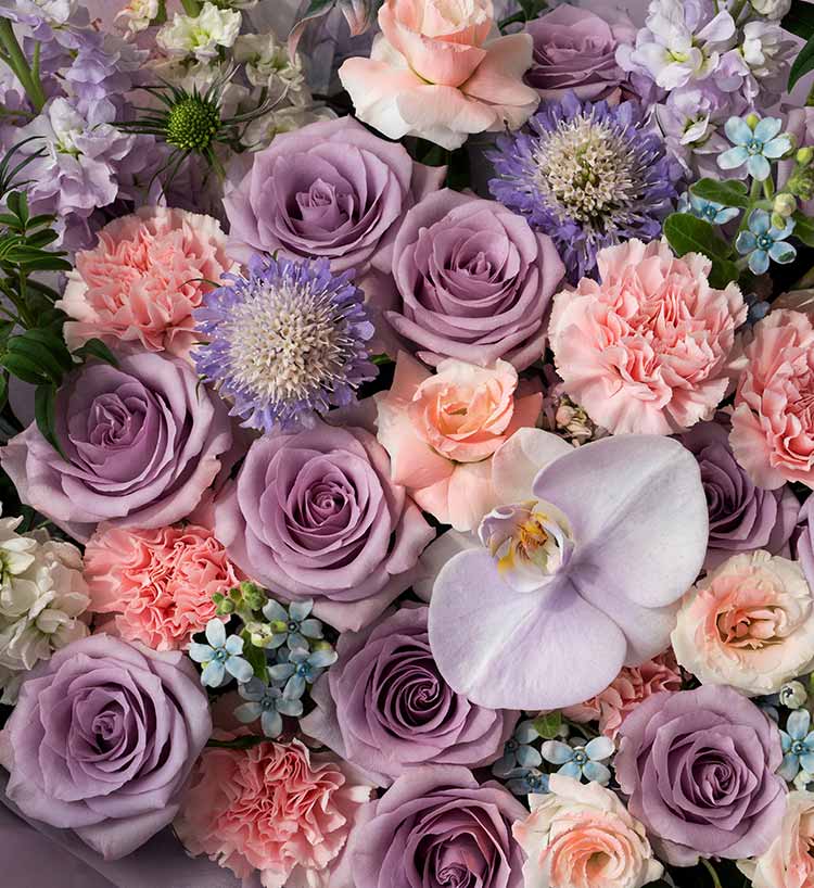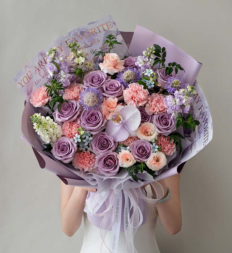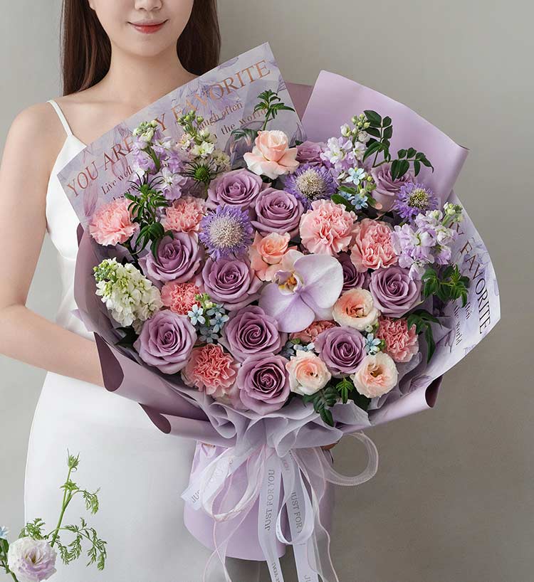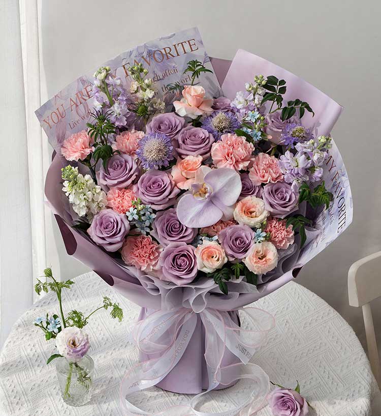 紫色玫瑰海洋之歌12枝,浅粉色康乃馨8枝,白色蝴蝶兰1朵喷淡紫色,紫色紫罗兰3枝,白色紫罗兰2枝,紫色松虫草3枝,白色桔梗喷粉色2枝(4头以上),九星叶5枝,蓝星花3枝