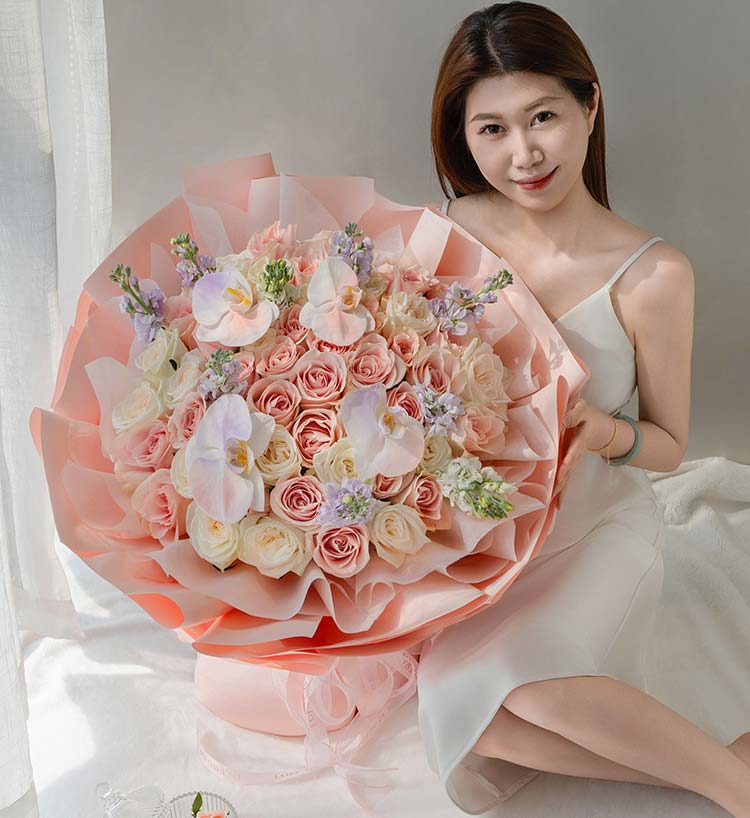 [520定制款] 粉色玫瑰32枝,白色荔枝玫瑰20枝,白色蝴蝶兰4朵