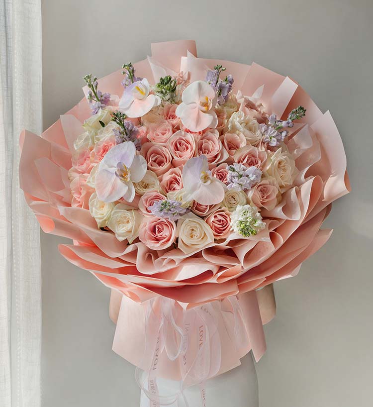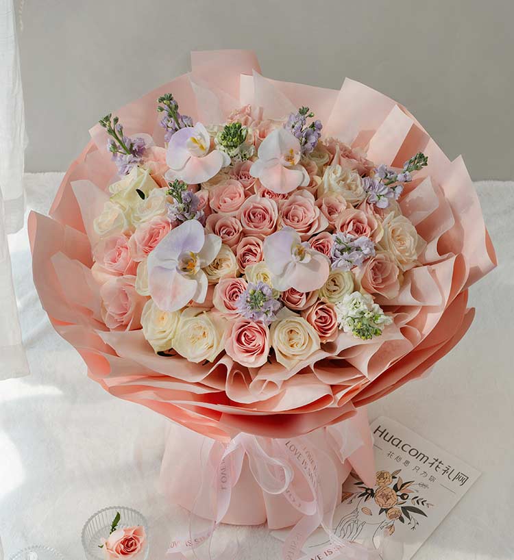 粉色玫瑰32枝(粉爱神或其他粉色玫瑰),白色荔枝玫瑰20枝,白色蝴蝶兰4朵(喷浅紫,浅粉),紫色紫罗兰7枝,白色紫罗兰2枝