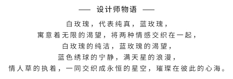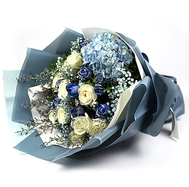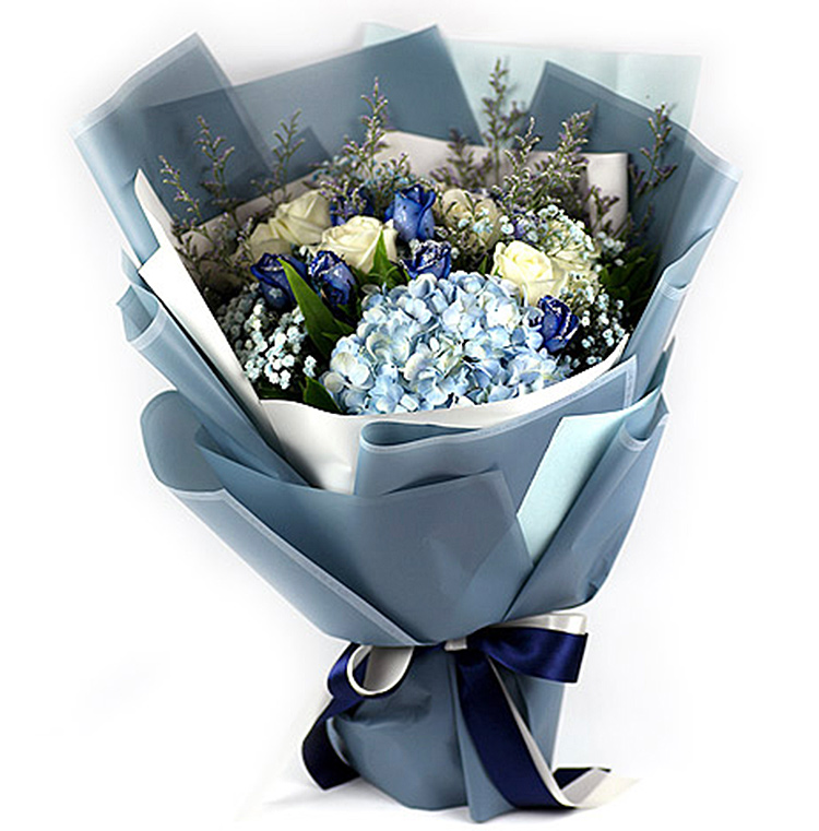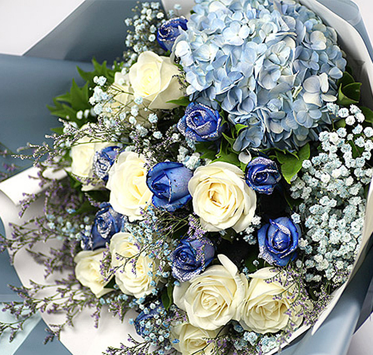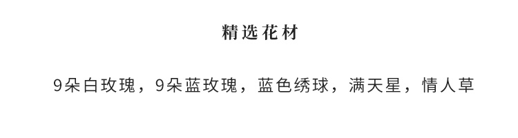 9朵白玫瑰,9朵蓝玫瑰,蓝色绣球,满天星,情人草