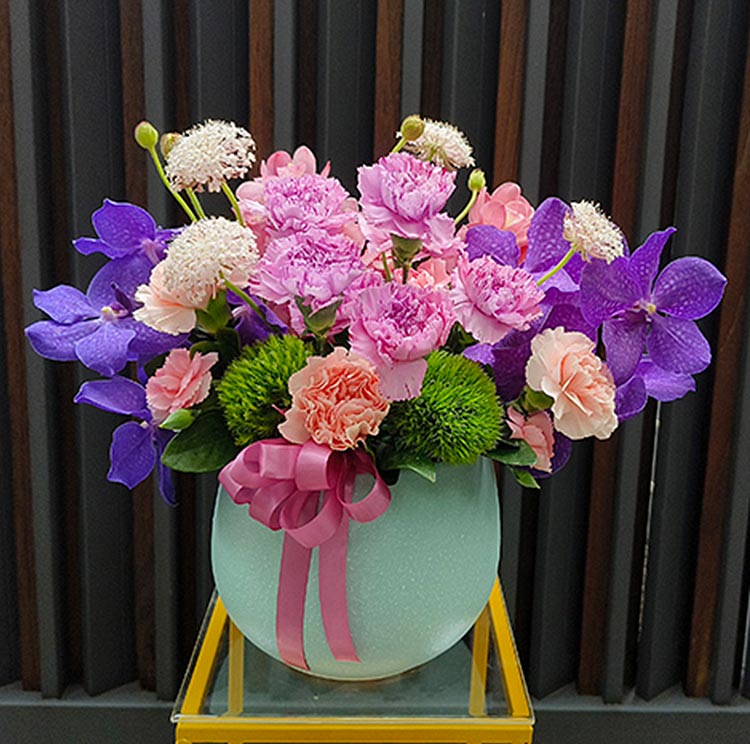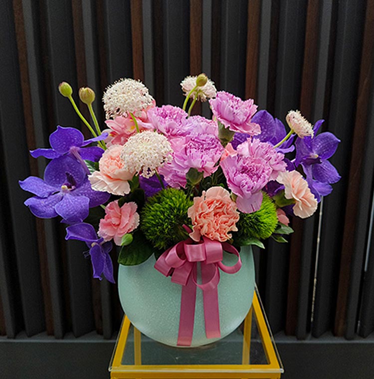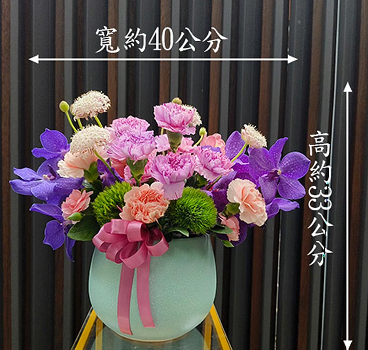 花材:浅紫色康乃馨5枝、粉色康乃馨5枝、巨轮兰花、绿石竹等花材