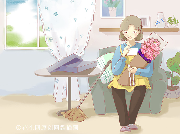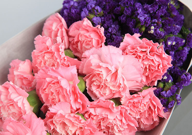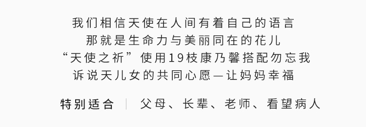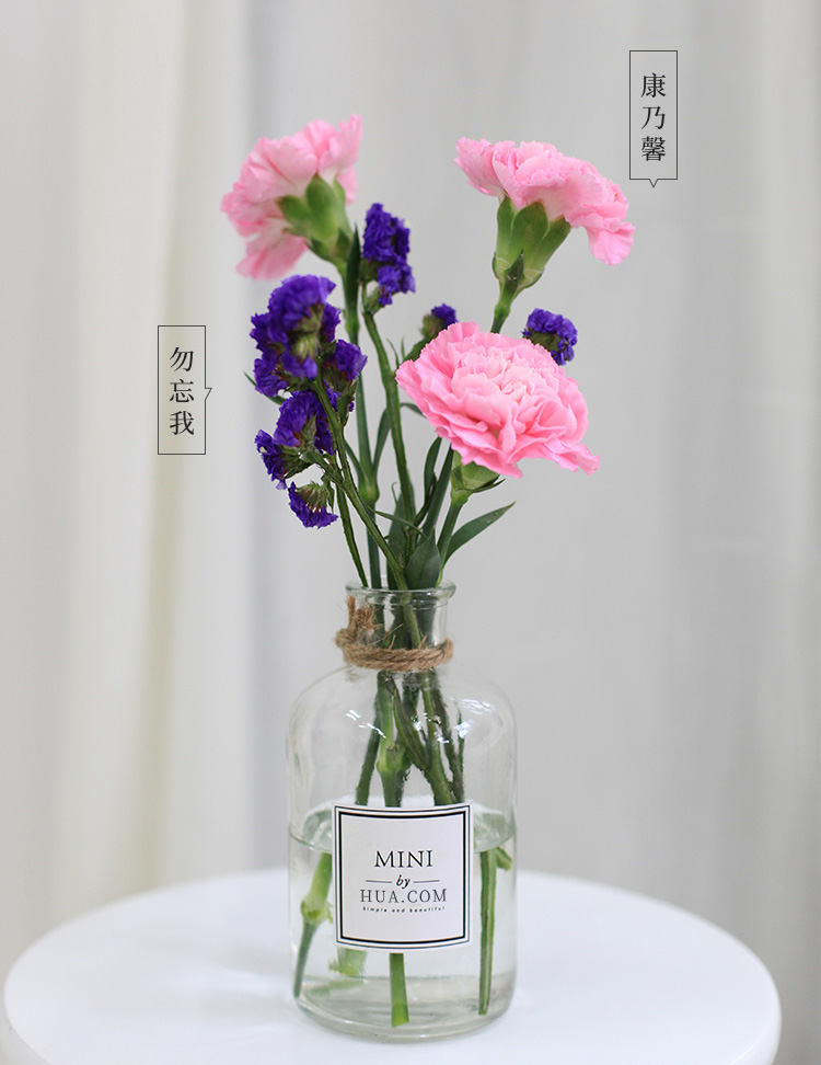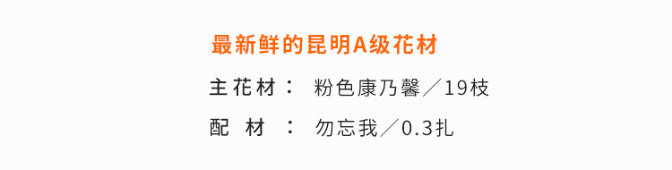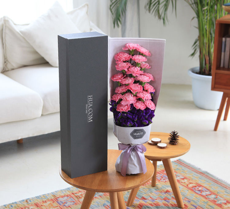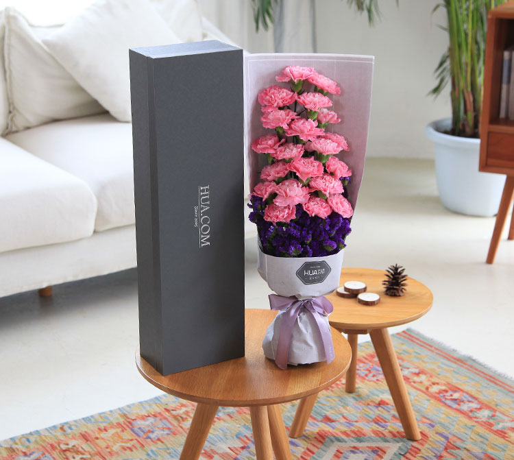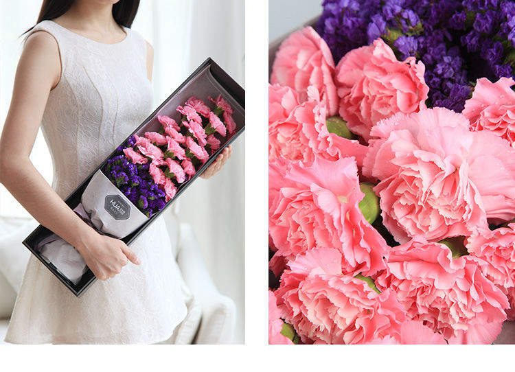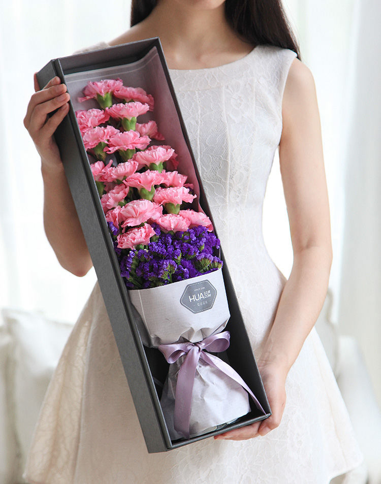 高档礼盒装鲜花: 粉色康乃馨19枝,勿忘0.3扎