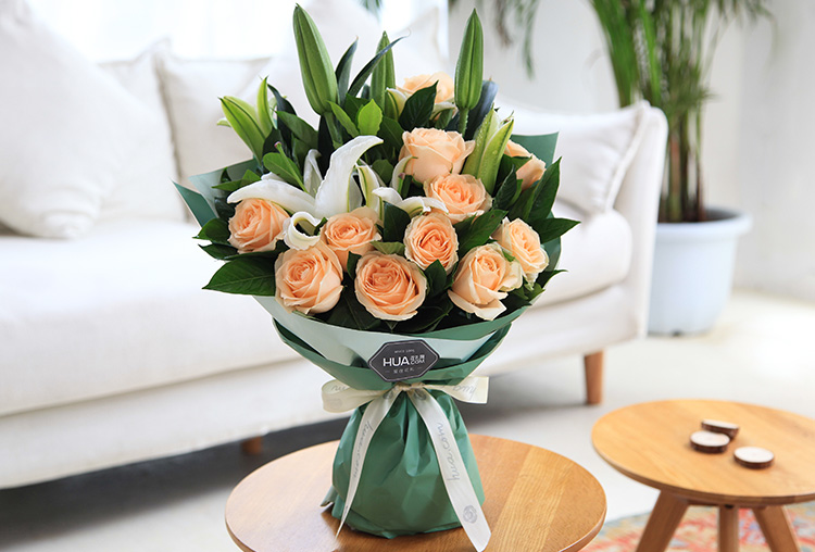 11枝香槟玫瑰,多头白百合2枝,栀子叶8枝