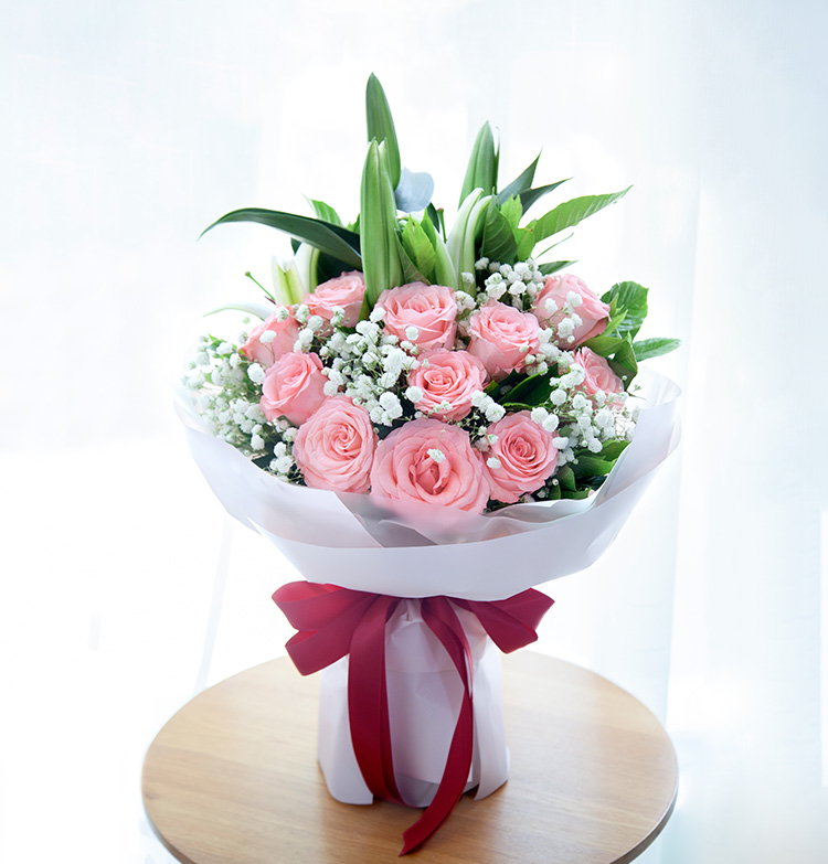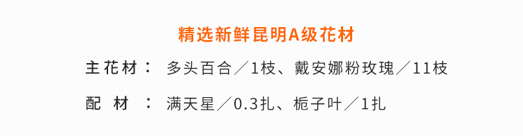多头百合1枝,戴安娜粉玫瑰11枝,满天星3枝、栀子叶10枝