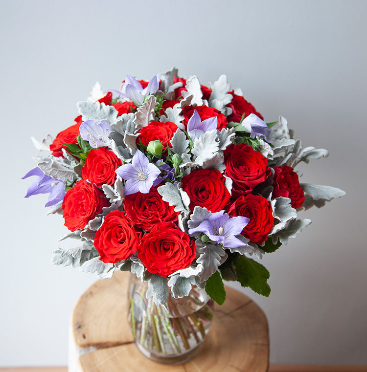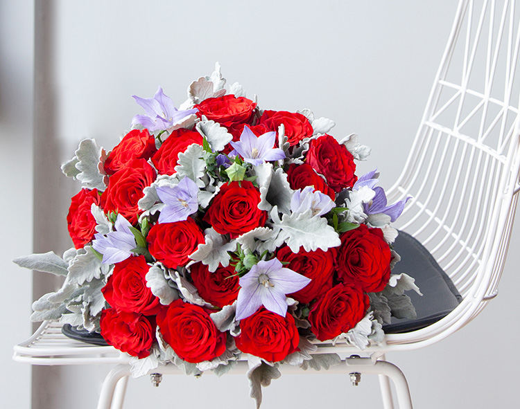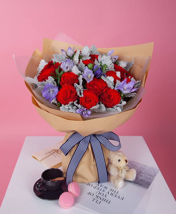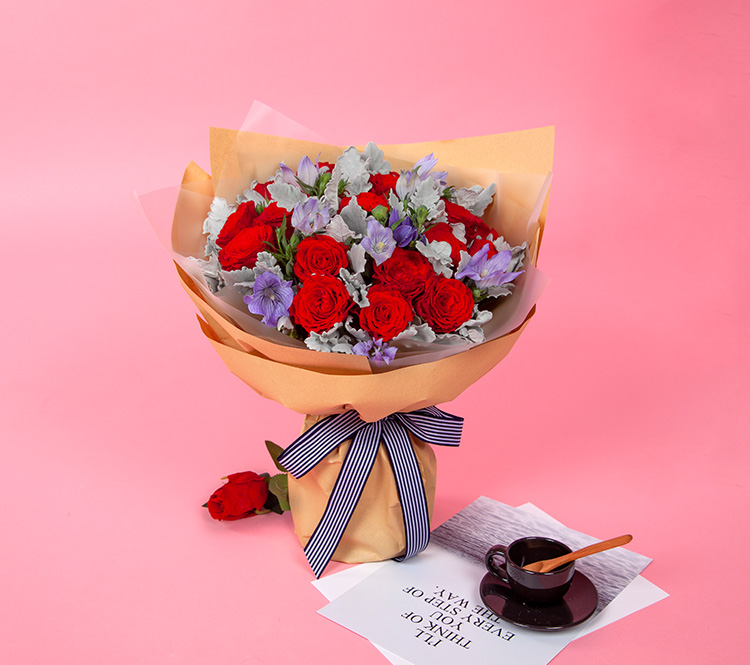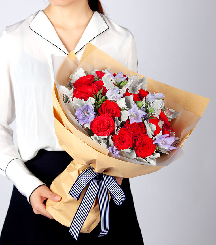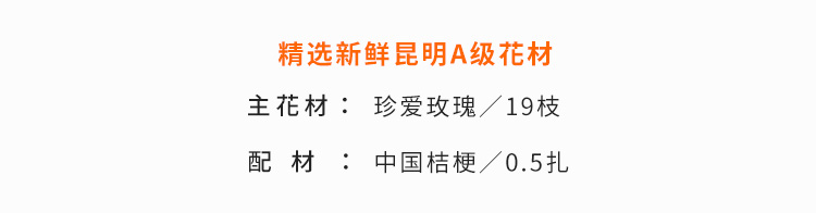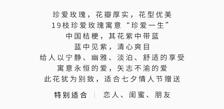 珍爱玫瑰19枝、中国桔梗0.5扎(如缺货用紫桔梗代替)、银叶菊1扎