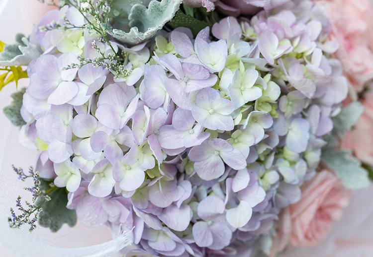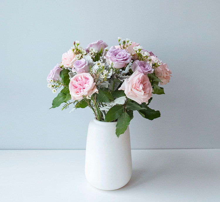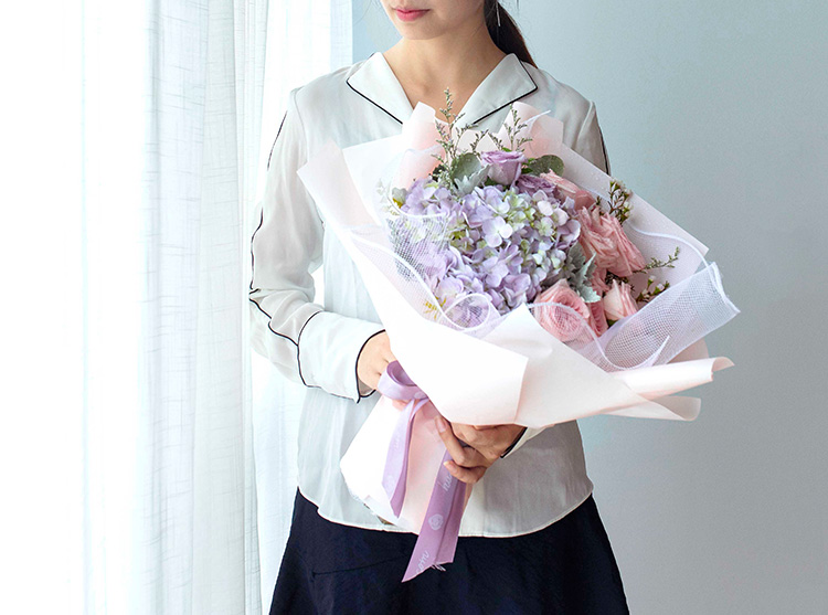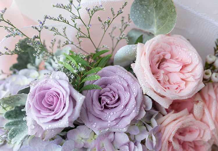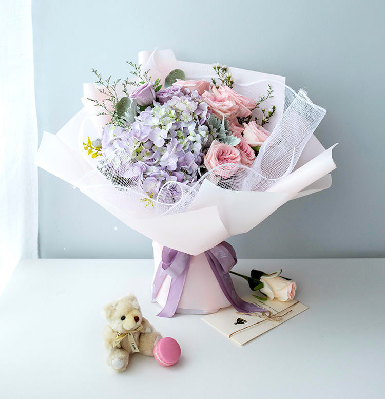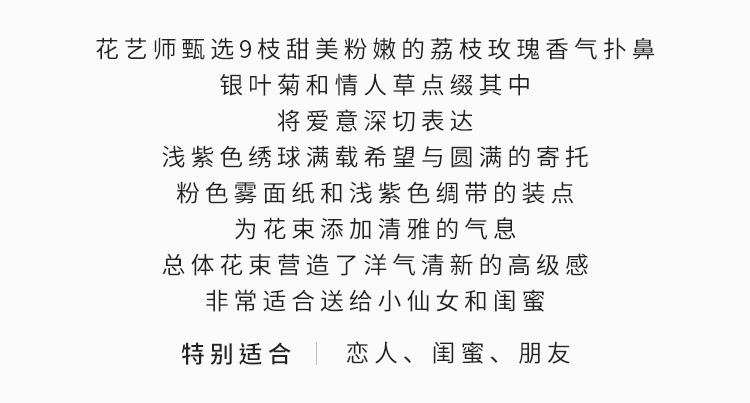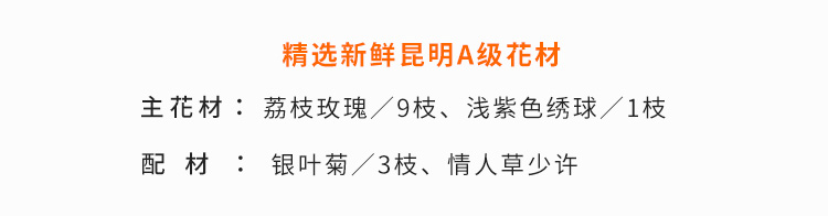 荔枝玫瑰9枝、浅紫色绣球1枝、银叶菊3枝、情人草少许