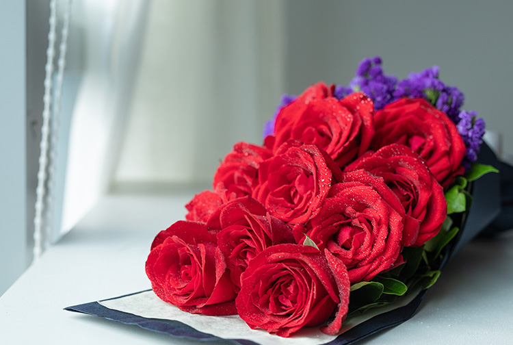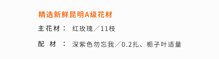 红玫11枝,深紫色勿忘我0.2扎,栀子叶适量