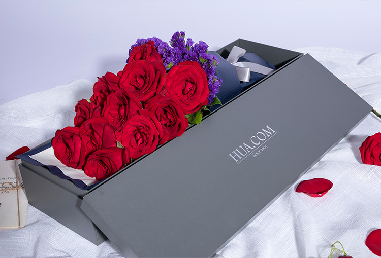 高档花盒1个,深蓝色条纹纸1张,米白色平面纸0.5张,银灰色缎带1米