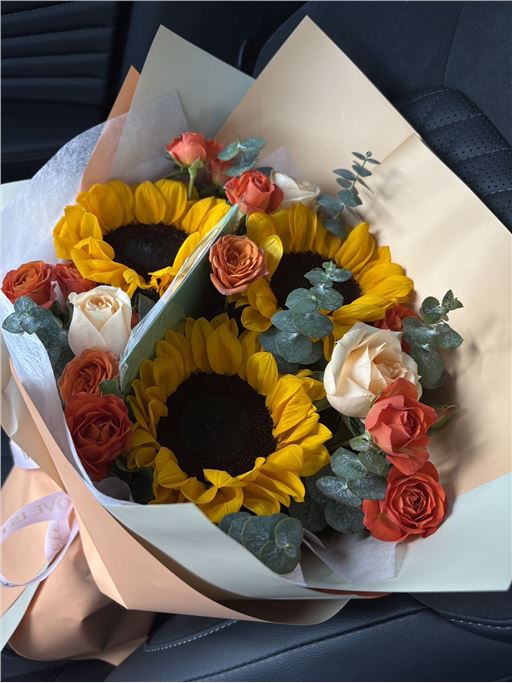 Thank you very much! Beautiful bouquet. Delivered on time, I liked everything. On-time delivery and high product quality It looks good! Same as the picture! The flowers are also very fresh! Sun flower is beautiful, roses are too. The recipient was surprised and pleased.