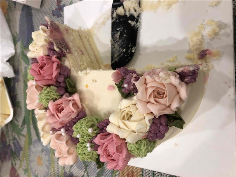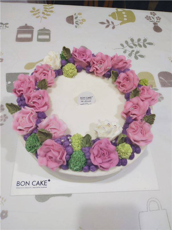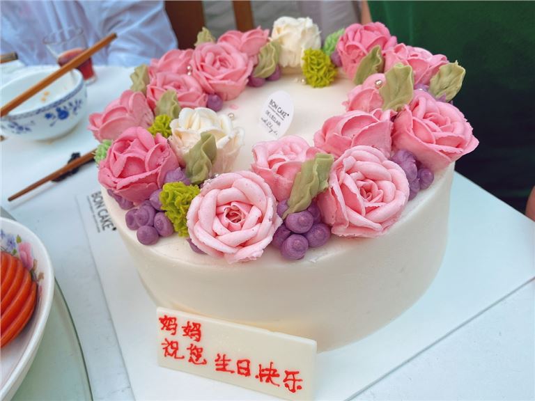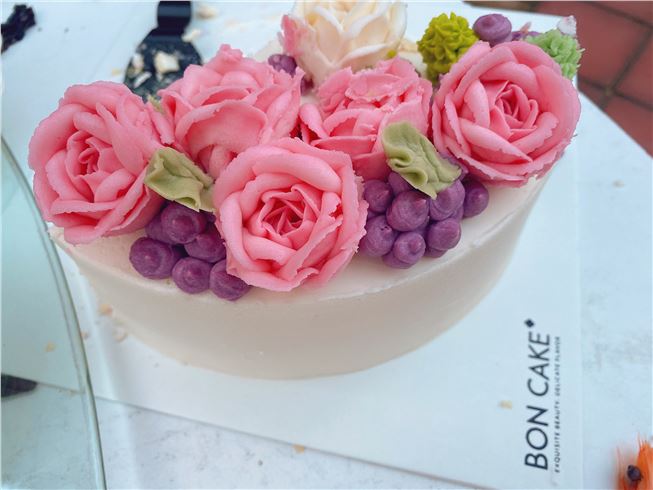 蛋糕非常漂亮,味道淡淡的甜味,甜而不腻,花朵是豆沙做的,很特别!