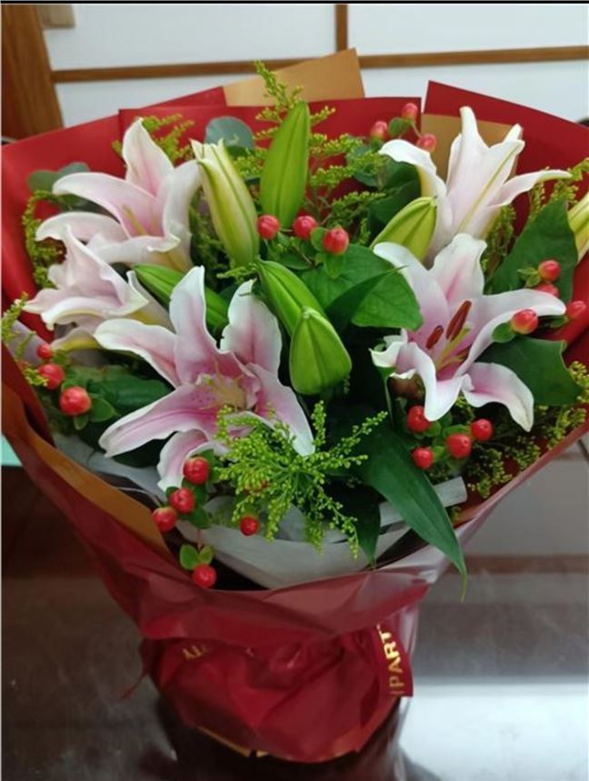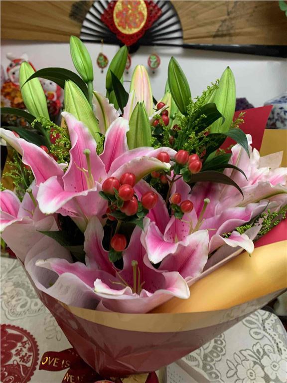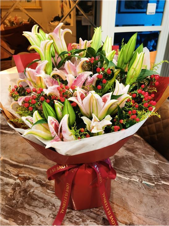 给家里老人过生日,如图一样,百合为主红豆和黄莺点缀,非常漂亮!