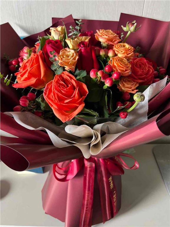 花很漂亮,很新鲜,搭配的很漂亮,看着很舒服很喜庆。下雪天送花很及时,真的挺不容易的……