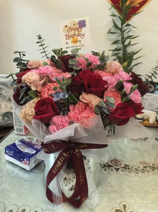 母亲生日当天收到这束鲜花,她特别高兴,连连夸花束颜色搭配温馨,花朵新鲜饱满,摆在客厅格外有气氛。红玫瑰搭配粉色康乃馨,既热烈又温柔,特别适合表达子女的心意。包装也很精致,整体质感很有档次。感谢花礼网,准时送达,服务周到,为妈妈的生日增添了幸福时光!强烈推荐!