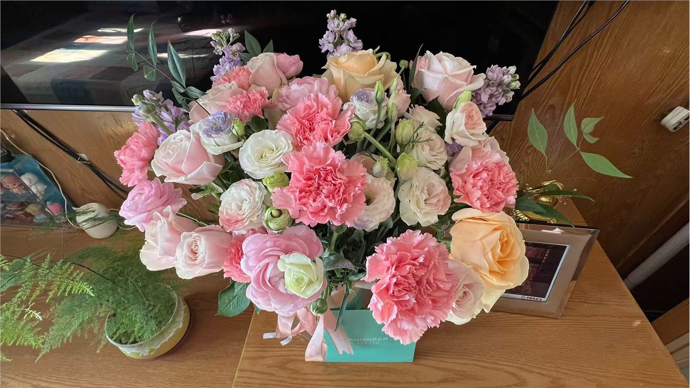 鲜花种类丰富,颜色搭配协调,烘托氛围温馨,捆扎包裹细致,运送抵达及时。突出甜心的主题,观之令人想要抱抱。